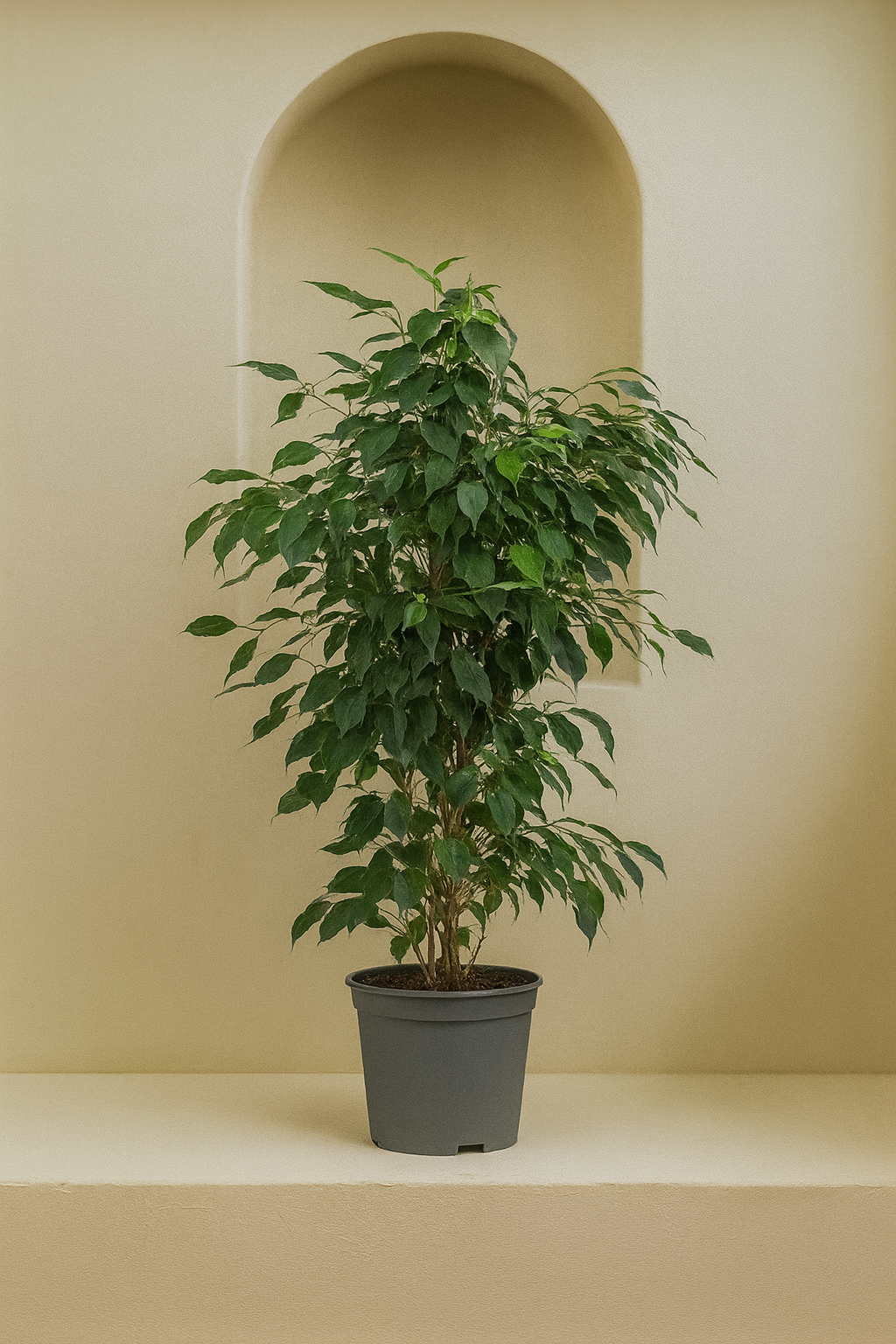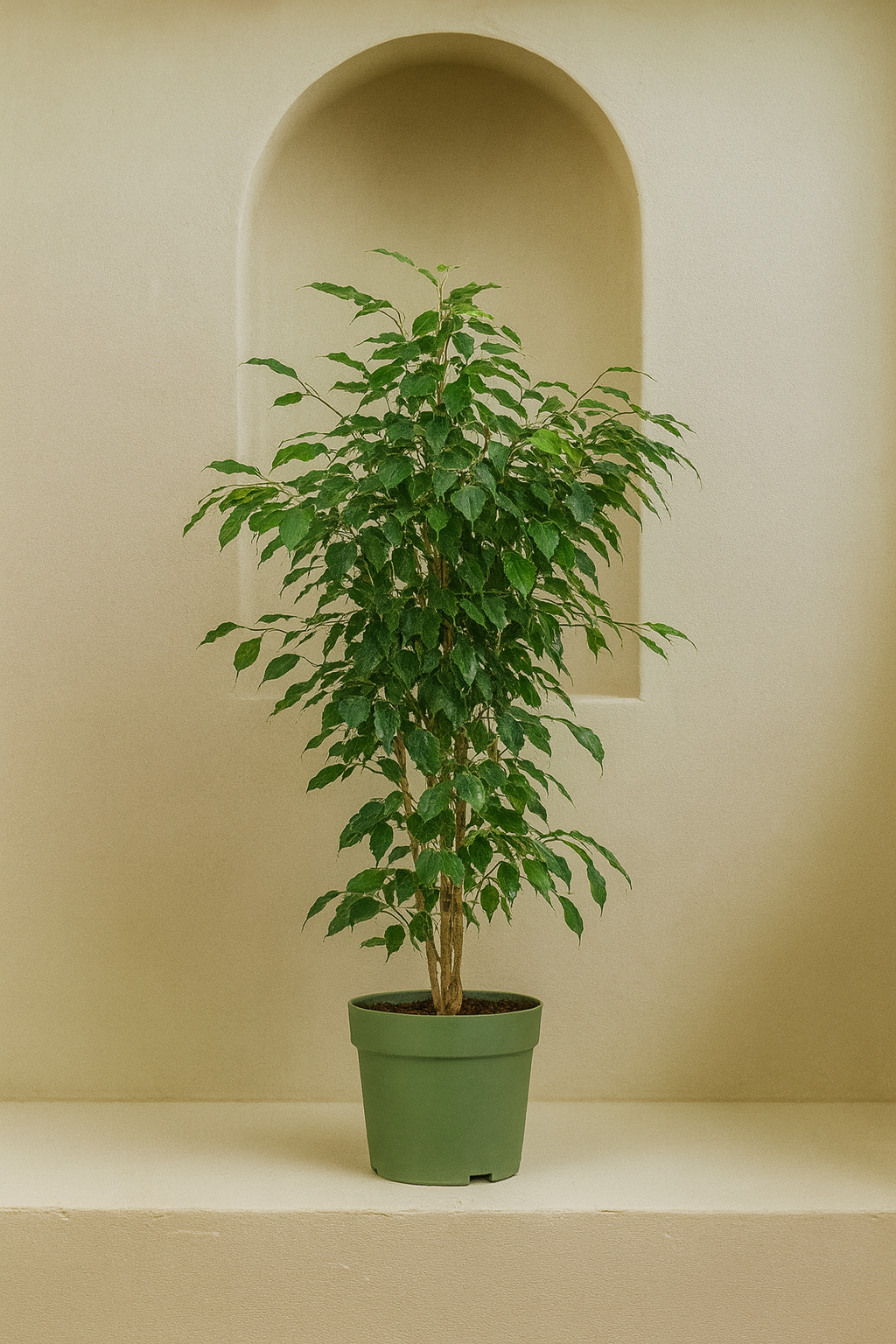 The Ficus Benjamina can reach heights of 1–2 meters indoors, making it ideal as a statement plant for living rooms, offices, or hallways. Its sleek trunk — often artistically braided or twisted — enhances its ornamental appeal, while its lush foliage purifies the air by removing toxins, promoting a cleaner and more refreshing environment.