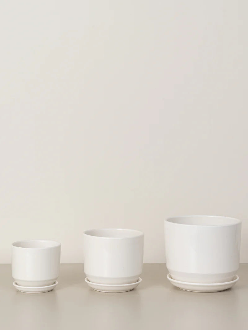 Introducing the Briana Pot Collection: a trio of round, short, white ceramic pots, available in three sizes and featuring both a classic glossy finish and a modern matte option. Elevate your space with their timeless elegance and versatile charm.